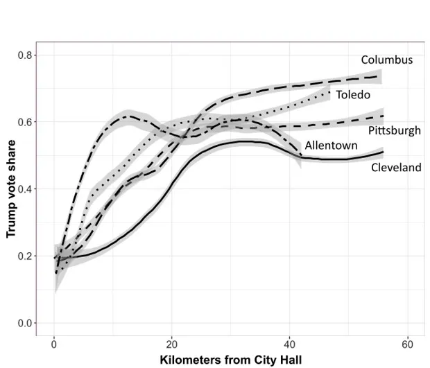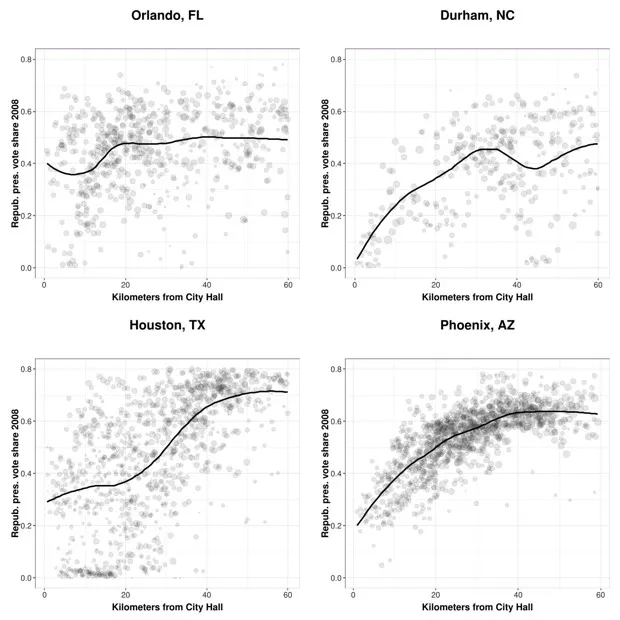 城市的密度梯度对党派的地理分布显得非常重要。在较老的城市中,民主党人在市中心高度集中,而当人们向郊区移动时,共和党的投票份额迅速增加,使得共和党获得舒适但并不压倒性的多数。