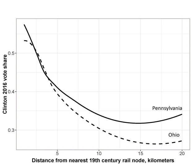 看到20世纪初一个地方的工业化程度与今天的民主党倾向之间的相关性令人震惊。我查看了旧的铁路地图,发现民主党人仍然高度集中在19世纪铁路交汇处,那些地方是100多年前工厂和工人阶级住房的所在地。