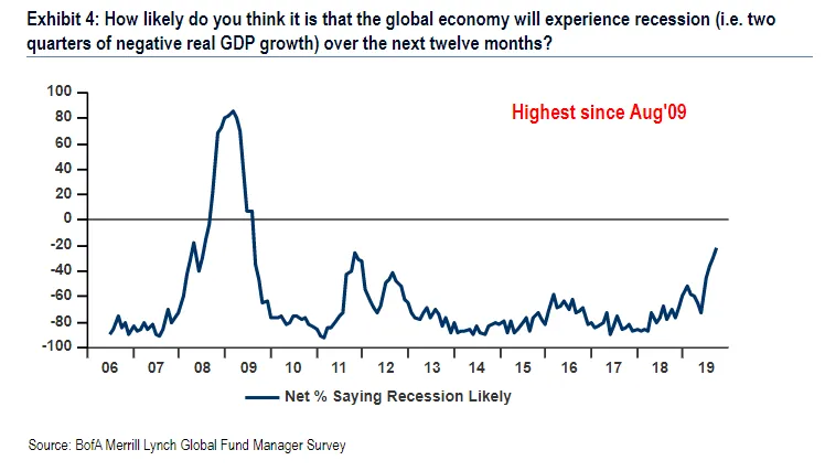 这种防御性配置是由于对全球(不一定是美国)经济的极度悲观预测。全球衰退的概率现在被认为高于自2009年以来的任何时候: