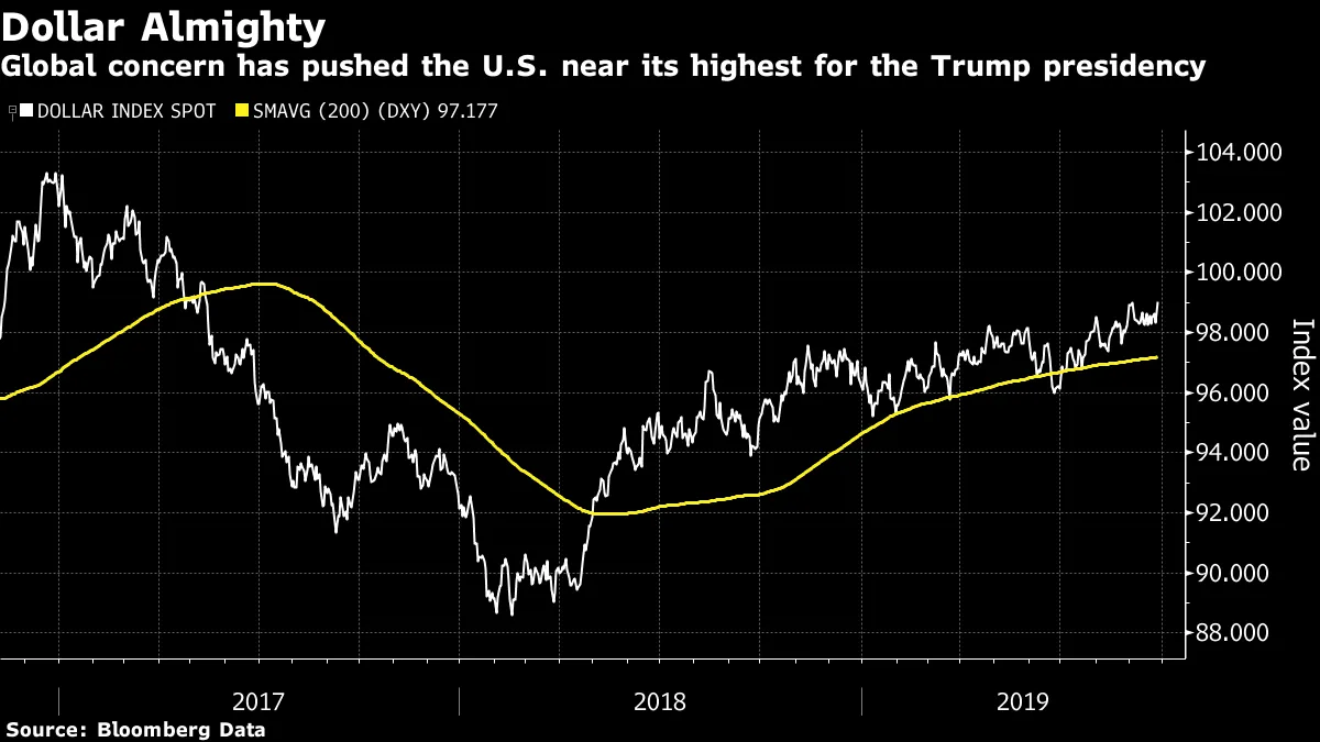 在这种情况下,美元受益,即使这个国家即将因总统弹劾而撕裂。美元现货指数衡量美元与其他发达市场货币的比率,目前大致处于特朗普总统任期初期以来的最高水平,并且远高于其长期趋势: