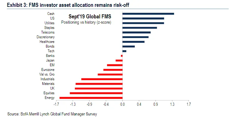 对美国资产的情况并不像最初看起来那么积极。投资者已经处于防御姿态一段时间了。这意味着将资金投入更安全的避风港,这意味着资金净流入美国。最新的美国银行美林全球基金经理调查发现了一种经典的“风险规避”资产配置,投资者在传统避风港(如现金和债券)上超配,而对美国的重仓现在已成为风险规避菜单的一部分。