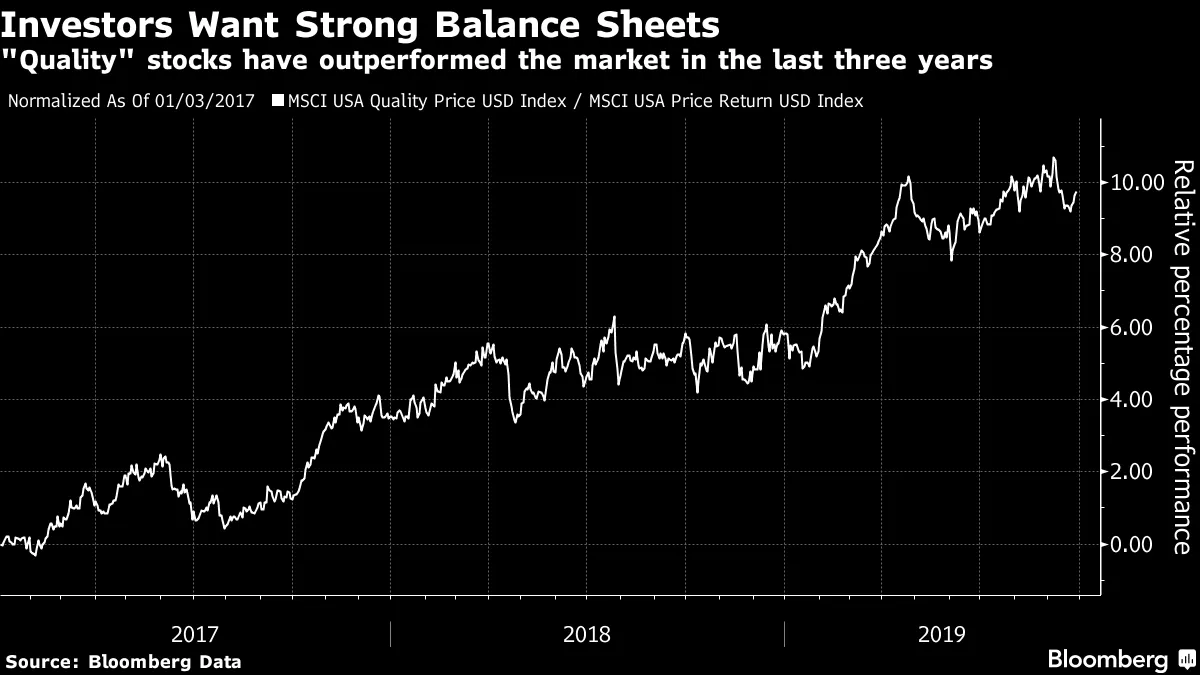 对杠杆上升的担忧的一个类比可以在 过去两年优质股票的强劲表现 中看到。“优质”标准通常包括一个干净的资产负债表。这是MSCI的美国优质指数在过去三年与主要市场的表现: