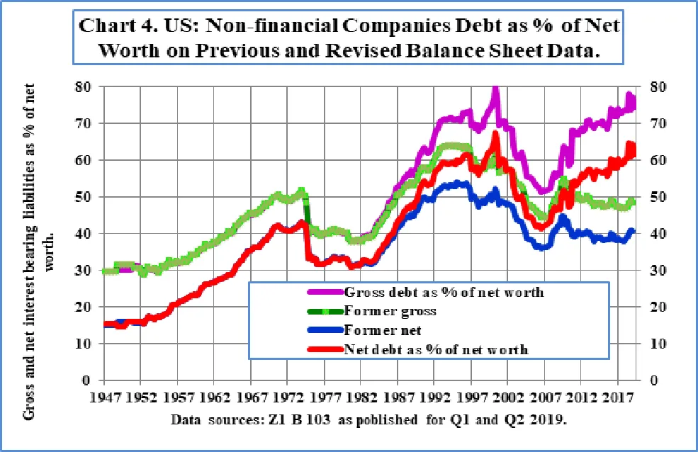 NIPA修订的一个可怕含义是,美国公司的杠杆率远比之前看起来要高。这张来自Smithers的图表显示了在之前的数据和修订后的数据下,净资产的总债务和净债务的比例。