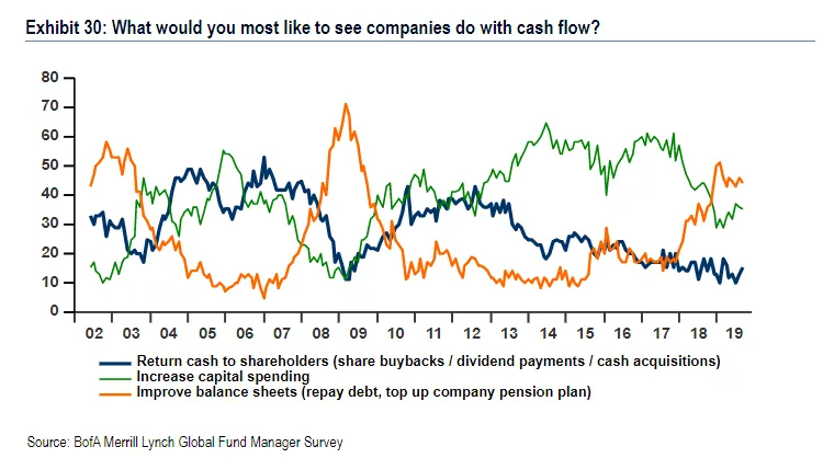 突然间,杠杆似乎几乎回到了互联网泡沫期间设定的战后高点。这令人担忧。事实上,这确实引发了警报。美国银行美林基金经理调查的一个发现, 我昨天报道过,是投资者已经改变了他们对公司如何使用现金流的偏好。在危机后的这些年里,他们希望更多的资本支出或现金分配给股东。在过去的12个月里,这种偏好被对公司清理资产负债表的强烈愿望所取代: