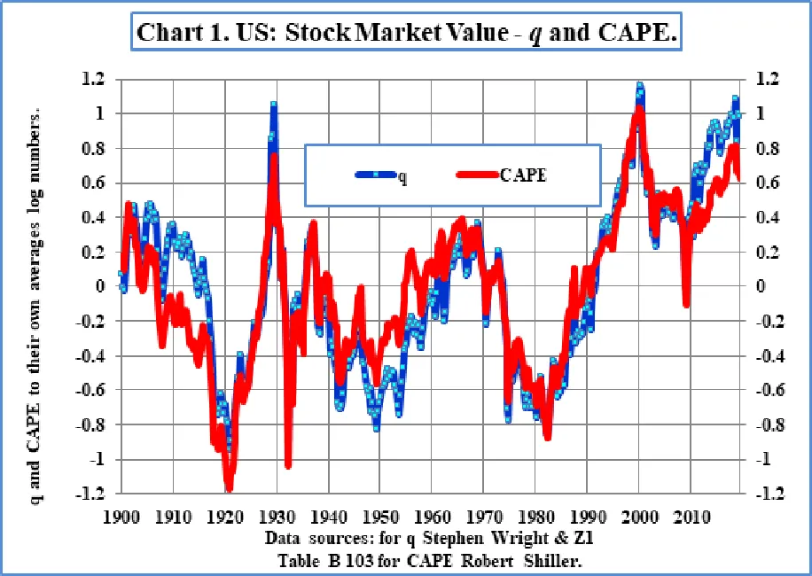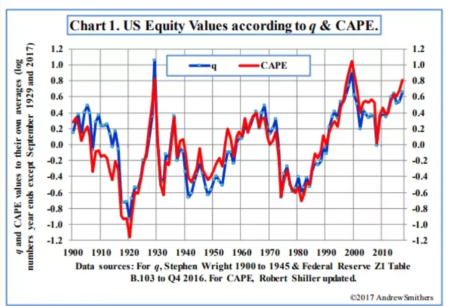 这是同一张图表,由史密瑟斯在2017年修订生效之前制作。在这一点上,CAPE显示出比q更严重的高估: