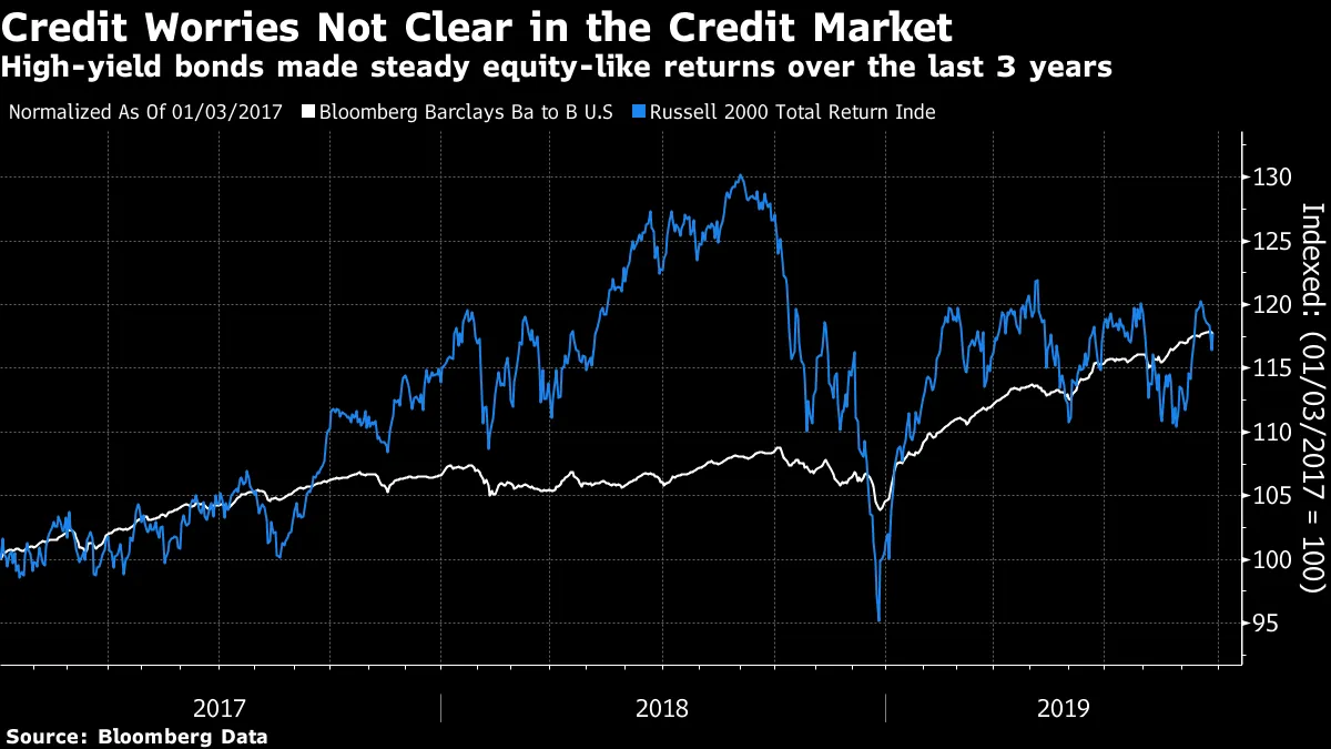 但尽管信用担忧在股票的相对表现中显现出来,但它们并未在高收益信用本身中显现。彭博社的Ba级和B级债务指数在过去三年中大致与小型股保持同步: