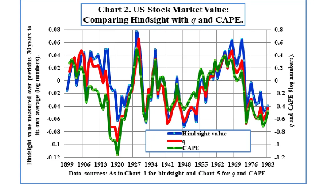 这个问题现在面临着被称为托宾 q 的指标——这是耶鲁大学诺贝尔经济学奖得主詹姆斯·托宾提出的一个概念,指的是公司市场价值与其资产替代价值的比率。在历史上,伦敦的经济学家和资产管理者安德鲁·史密瑟斯,经典著作 《华尔街估值》 和 《华尔街再估值》 的作者,已经证明 q 是最有效的长期估值指标,其次是现在广泛与另一位耶鲁诺贝尔奖得主罗伯特·希勒相关联的周期调整市盈率(CAPE)。这两种指标在时机把握上没有任何用处,但它们在预测10年或更长时间的后续回报方面表现出色。在这张图中,“事后诸葛亮”(蓝线)表示从每个日期实际产生的30年回报,而其他线条则显示使用 q 和 CAPE 生成的预测: