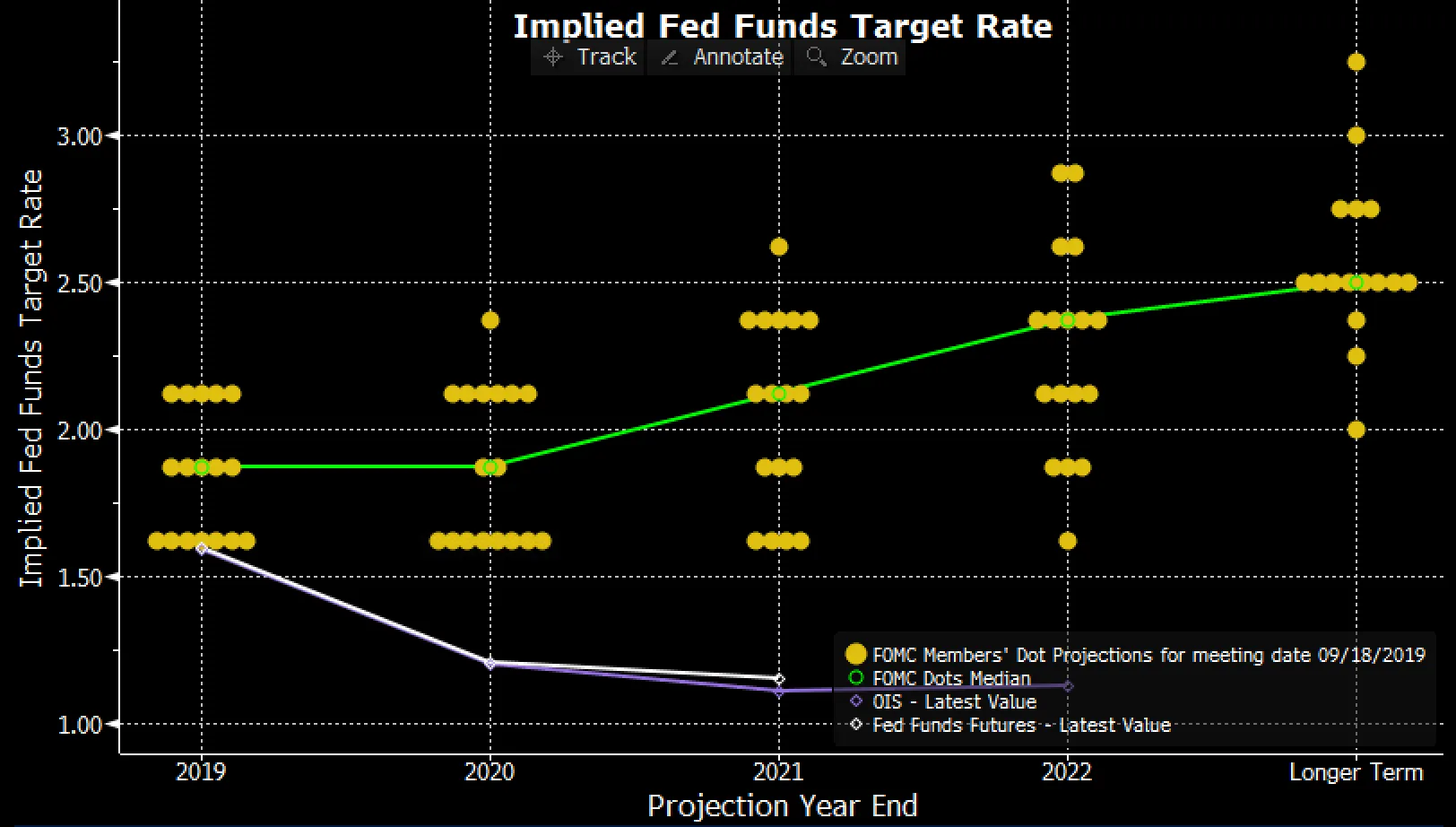 这有什么重要性?首先,让我们尽可能模糊地绘制出今年剩余时间的点阵图,以尝试推测如果金融条件没有太大变化,经济活动大致按计划展开,贸易紧张局势既没有加剧也没有缓解,可能的美联储结果。