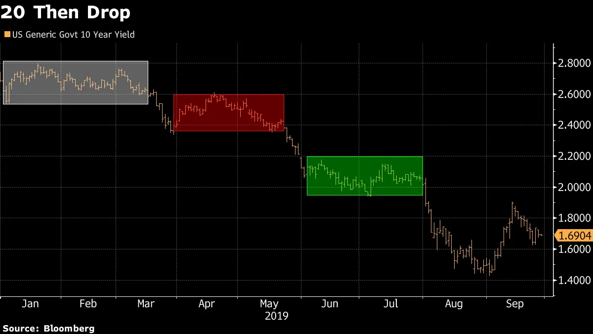 彭博社彭博社如果股市变得对收益率稍微不那么敏感,这可能对风险看涨者是个好消息。在国内信心减弱、持续的美联储宽松周期、不断出现的相互矛盾的贸易头条、海外活动乏力,以及现在可能对美国总统唐纳德·特朗普的弹劾的背景下,依赖上升的收益率推动市场上涨似乎就像逆流而泳。
