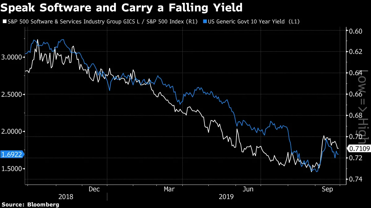 对于软件股票——牛市中最重要的贡献者——过去一年相对表现与债券市场动态的关联程度令人惊讶。这里的思路是,收益率下降反映了对未来全球活动的担忧,因此那些显示出结构性优越盈利特征的股票(如软件类成长股)备受青睐。请注意相对股票表现的反向轴!