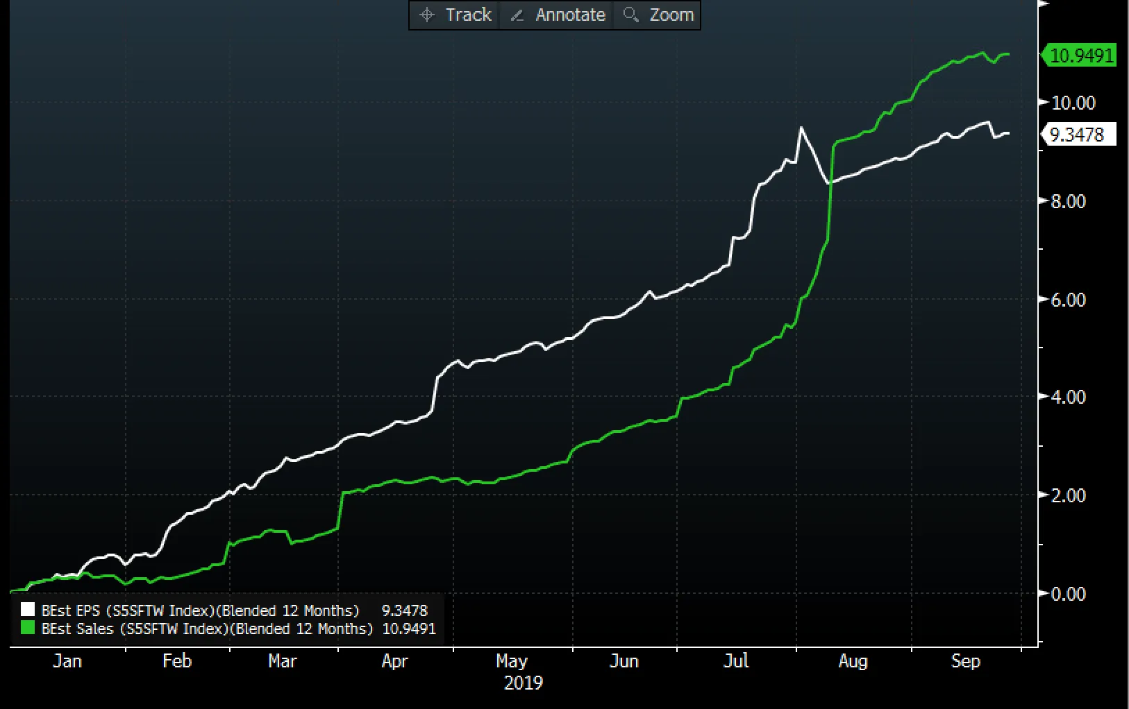 因此,看到软件股票(根据IGV ETF的判断)在周三反弹,突破其200日移动平均线,逆转了大幅亏损,并最终超越基准指标,这尤其令人鼓舞——在这一交易日中,收益率上升。 如果软件(恰好是标准普尔500指数中最大的行业组)出现疲软,市场的其他部分很难提供足够的补偿。 尤其是因为这一市场细分的盈利预期逆势而上,不断攀升。