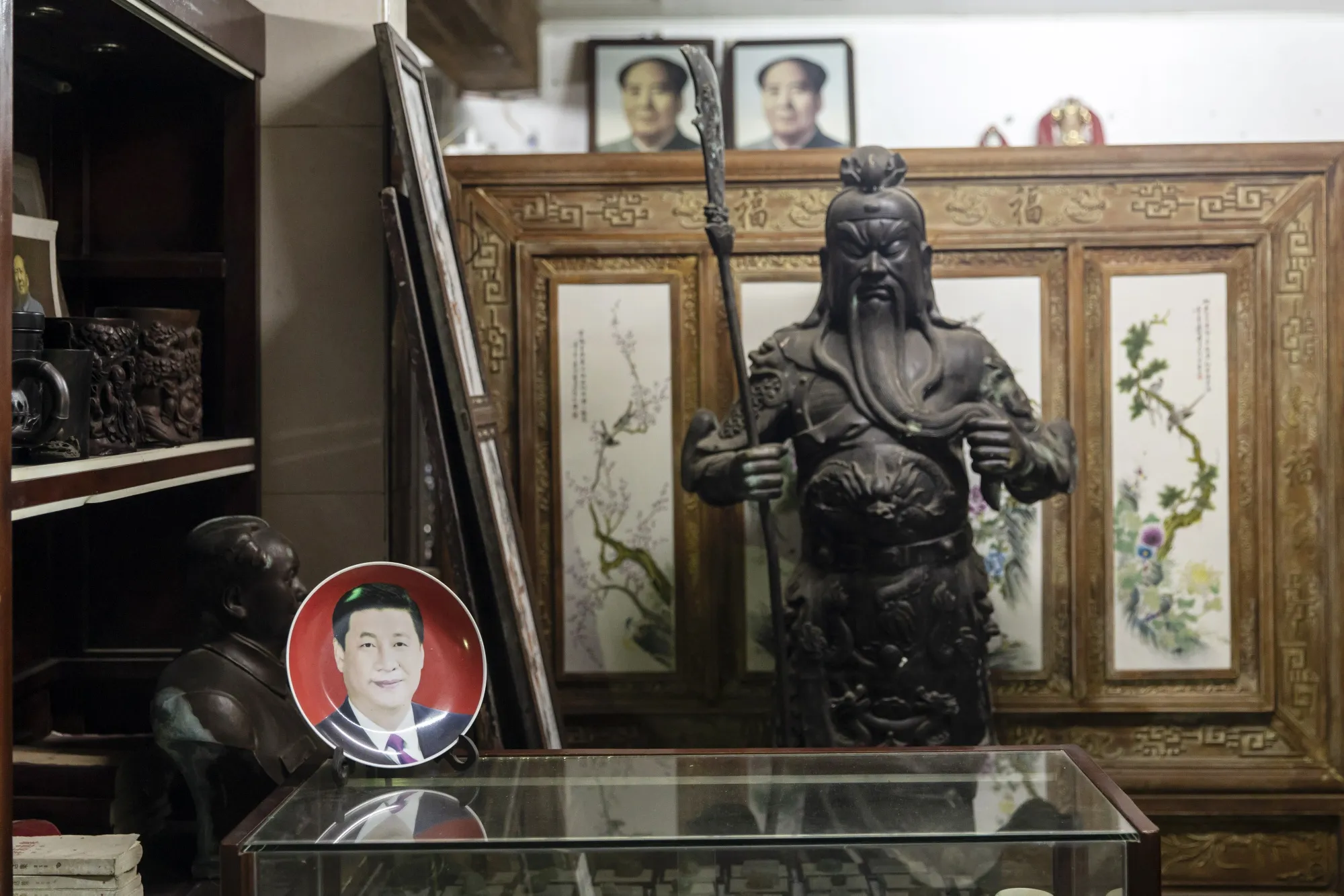 一块带有中国国家主席习近平图像的盘子和一件关羽的木雕,关羽是东亚最受欢迎的忠诚与正义的典范之一,展示在一家木雕和雕塑店内。摄影师:Qilai Shen/Bloomberg在一个前军事总部的小房间里,干部们甚至排队坐在习曾经坐过的椅子上与当地人交谈。