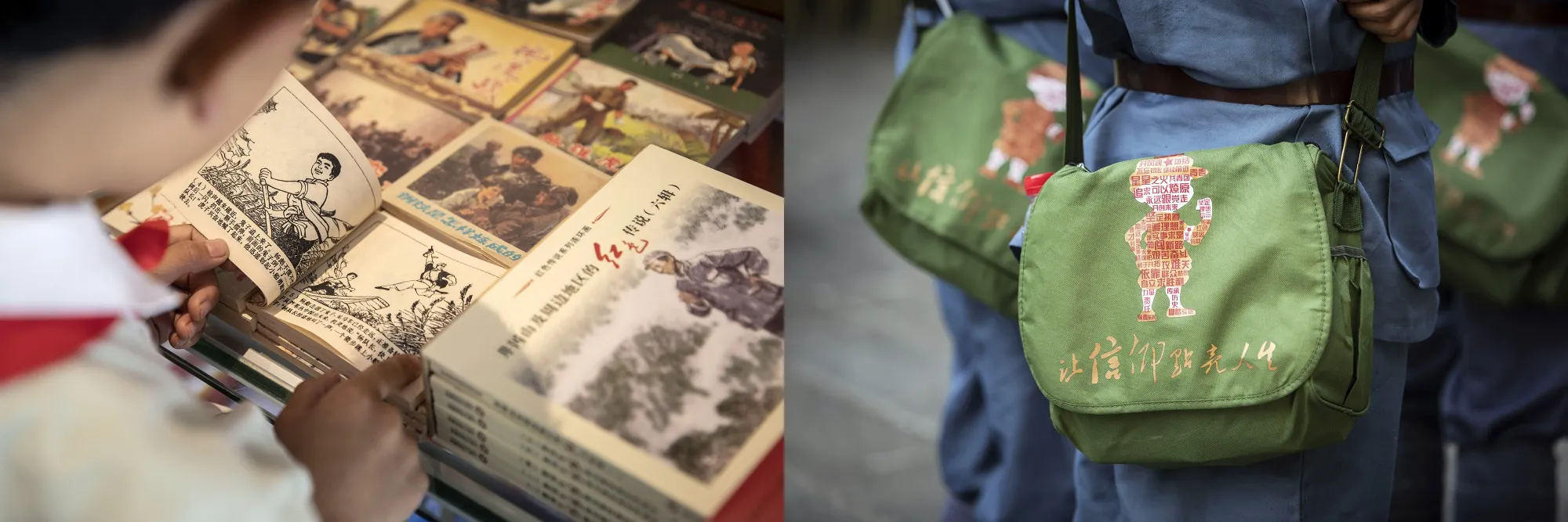 从上到下顺时针:干部们参观毛泽东的故居八角楼,因屋顶开口的形状而得名;袋子上写着“让信仰照亮你的生活”;游客参观第一届中国共产党大会的建筑;一名佩戴红领巾的少先队员在井冈山革命烈士陵园的纪念品商店里阅读漫画书。摄影师:沈其来/彭博社### 山中隐居