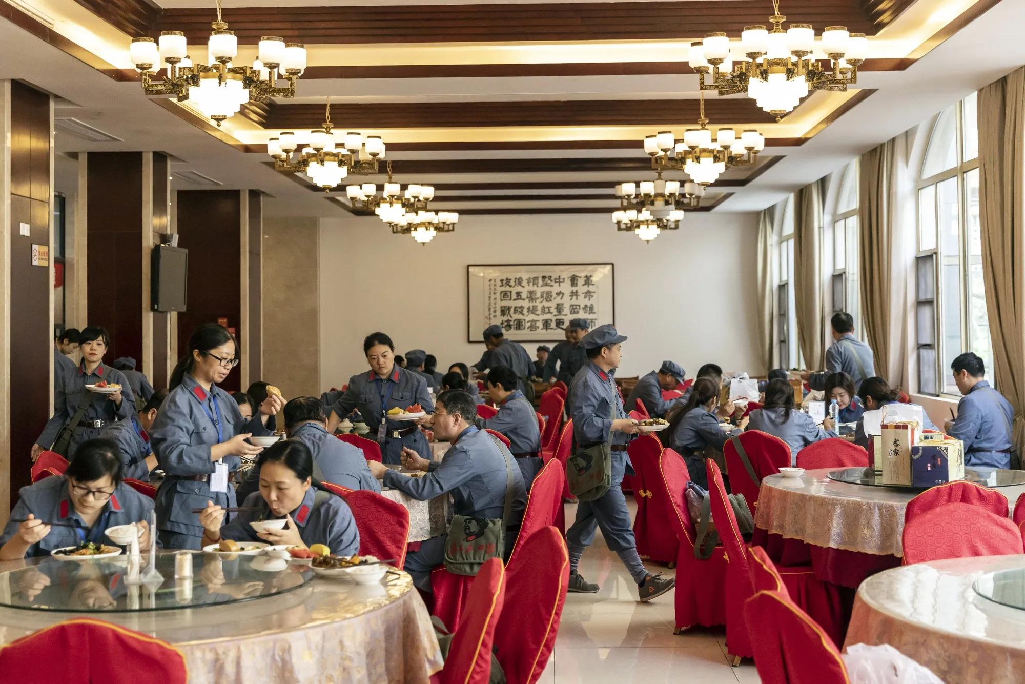 从上到下:南山公园的晨练;干部们在江轩酒店享用自助午餐。摄影师:沈奇来/彭博社### 秘密与牺牲