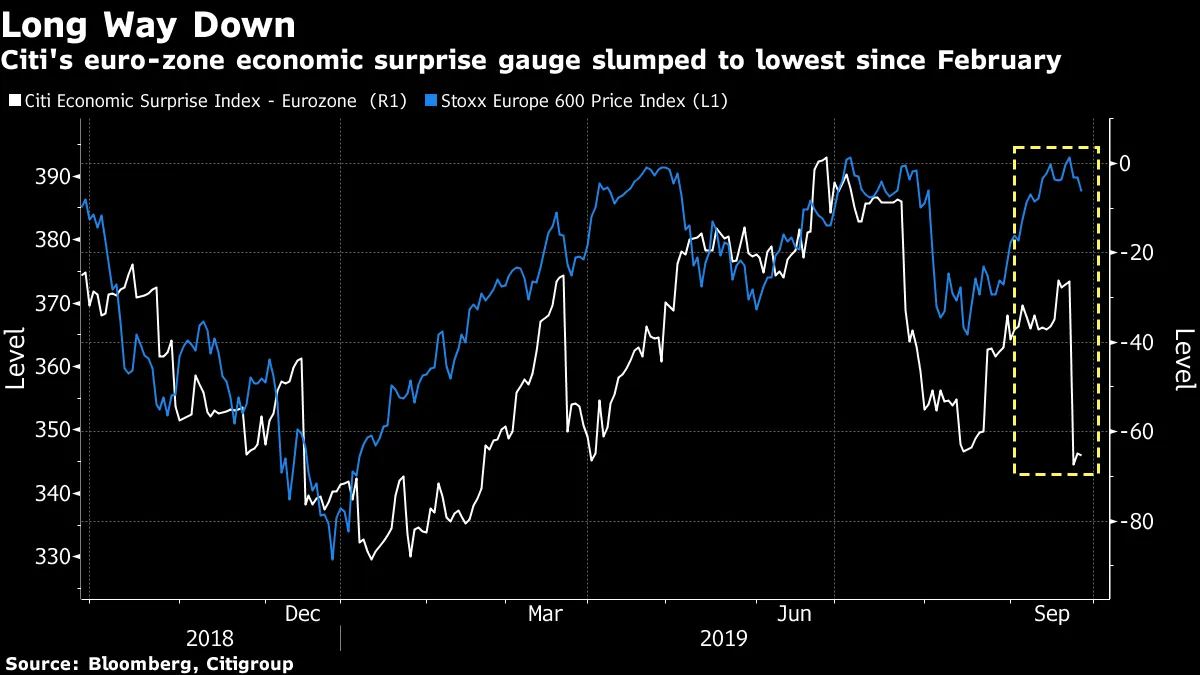 进一步的情绪减弱迹象在周二出现,本月德国的商业预期降至十年来的最低点。工厂高管的情绪是主要原因,Ifo研究所表示,情绪报告的唯一方向是“向下”。这一消息对欧洲最大经济体又是一次打击,因为周一的报告显示,工厂活动以自金融危机最严重时期以来最快的速度萎缩。尽管基准Stoxx 600指数仍然保持着年初至今16%的涨幅,但日益加深的阴霾很快转化为获利了结也不足为奇。