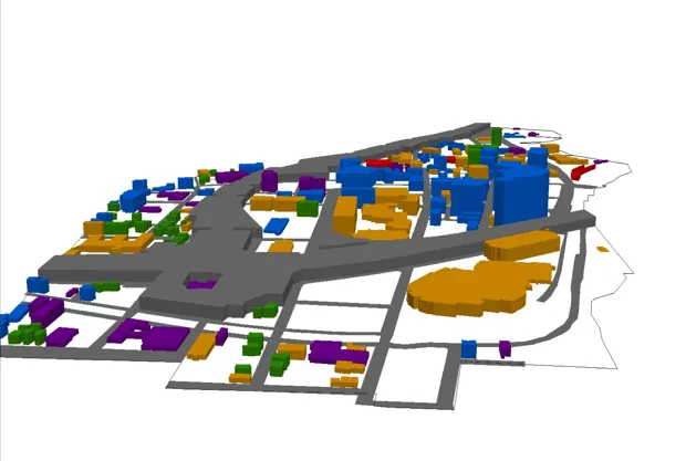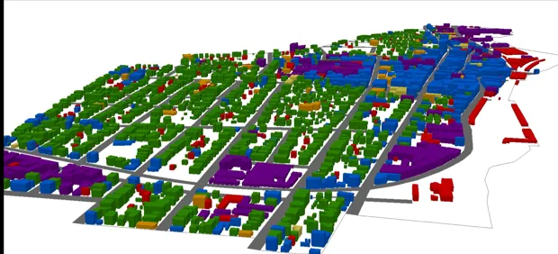 举一个例子,几年前我的一位学生,Kristin Floberg,研究了旧的火灾保险地图,以清点康涅狄格州布里奇波特市的每一座建筑,然后制作了一张显示1913年城市样貌的3D地图,在它被“工程化”以解决交通拥堵之前。然后她将其与现代城市的土地使用模式进行了比较。(绿色建筑为住宅,蓝色为商业,紫色为工业,红色为交通存储,橙色为免税的市政建筑;道路和高速公路为灰色。)