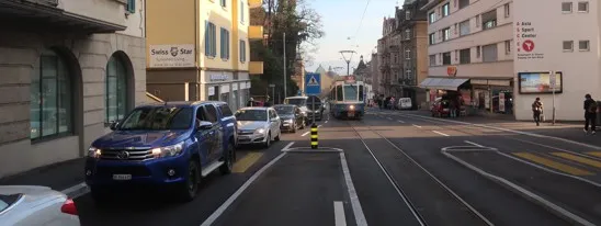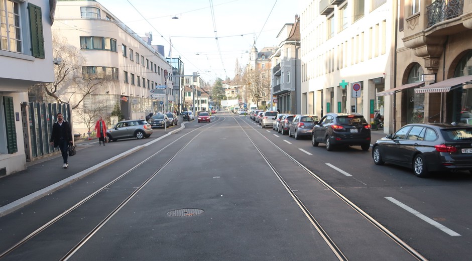 在某种程度上,这一场景代表了一种交通和城市规划的罗夏墨迹测试**。如果你是乘坐有轨电车的乘客,行驶在占据大部分街道的两条轨道之一上,这一场景代表了移动的自由和在苏黎世公共交通的优越感。如果你是行人,这是一条相对舒适的街道,拥有便利的服务、餐馆和一些有趣的商店(可以去看看位于哈尔登巴赫街拐角的模型火车商店)。如果你骑自行车,这条街道和苏黎世的大多数其他街道一样,尚可,但并不出色。**