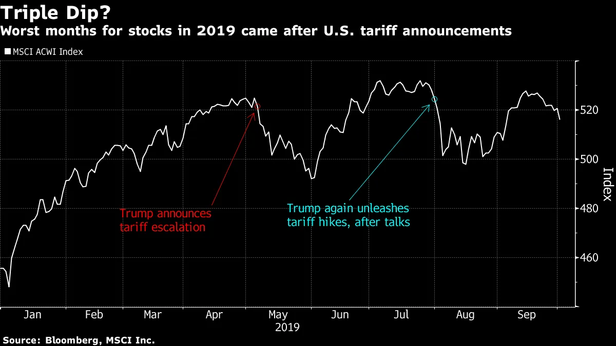 回想一下仅仅两个月前。特朗普在8月1日宣布提高关税,紧接着美国贸易代表罗伯特·莱特希泽和财政部长史蒂文·姆努钦从上海返回。更早之前,特朗普在5月5日再次宣布提高关税,这也是在莱特希泽和姆努钦访问北京之后。这些公告动摇了市场,毫无疑问,它们是今年全球股票表现最糟糕的两个月。会不会出现三次下跌?我们可能很快就会知道。