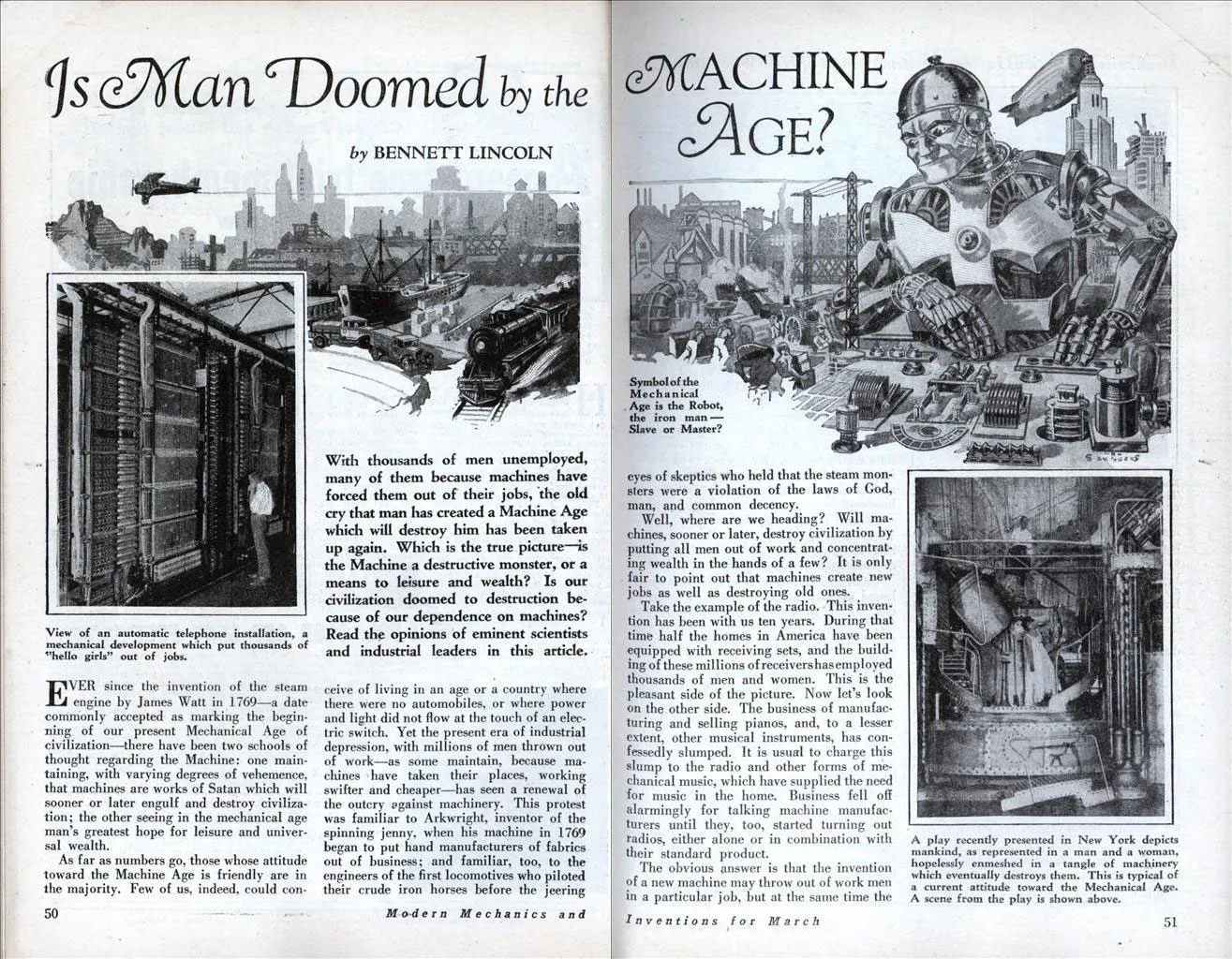 摘自1931年一期的现代机械与发明。在10月28日至29日股市崩盘前的一周,纽约的一个国家商业展在一个与中央车站相邻的会议中心(已被拆除)举行,许多华尔街人士在上下班时经过该展览。展览强调了办公室工作场所机器人技术的巨大进步。在展览于11月移至芝加哥后,以下描述出现在芝加哥日报:
