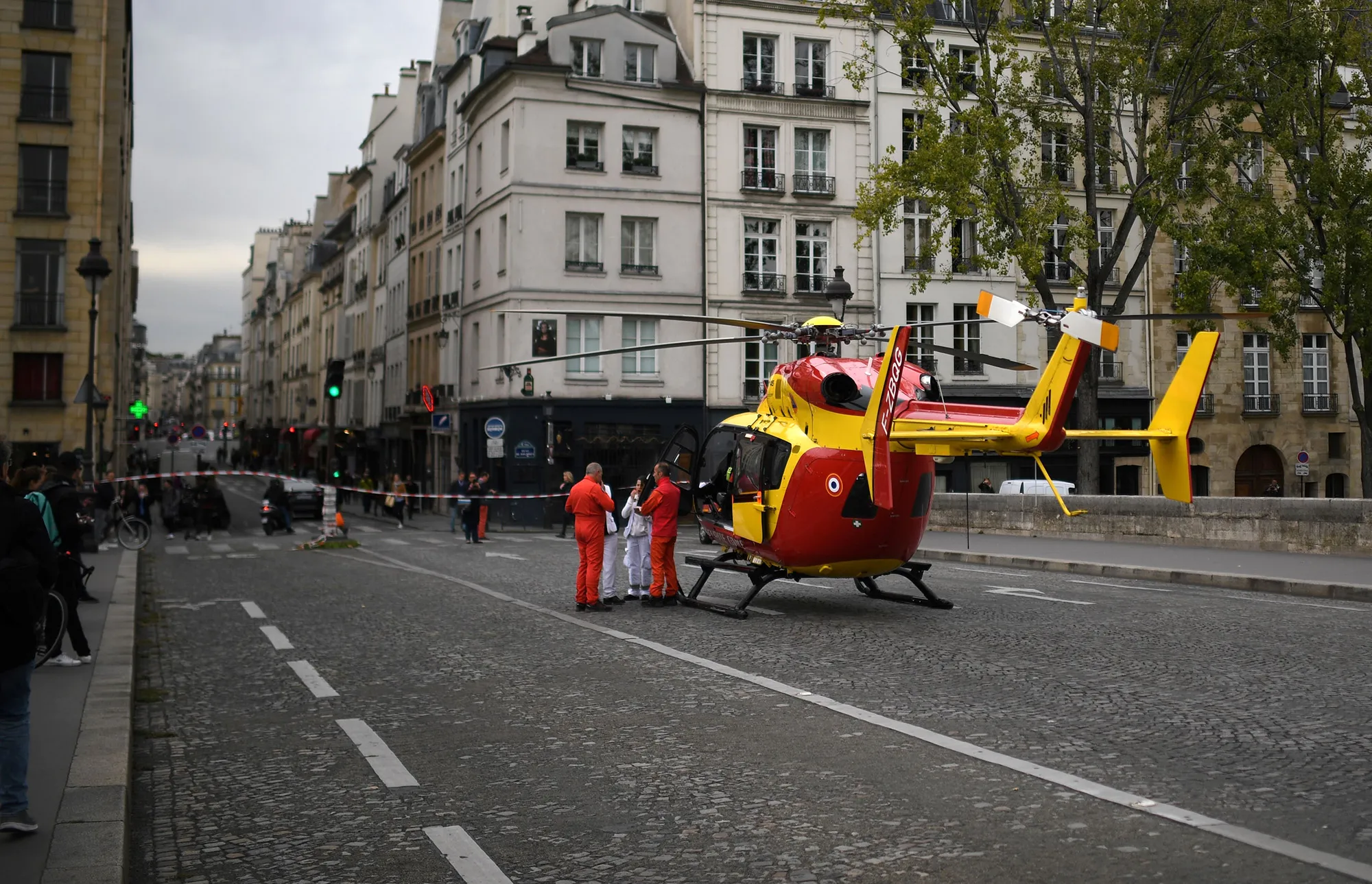 紧急人员在巴黎警察局附近的Pont Marie旁边站在一架空中救护直升机旁,2019年10月3日,三人因刀袭受伤。摄影师:马丁·布鲁尔/法新社巴黎的紧急救援人员和一架空中救护直升机。摄影师:马丁·布鲁尔/法新社通过Getty Images
