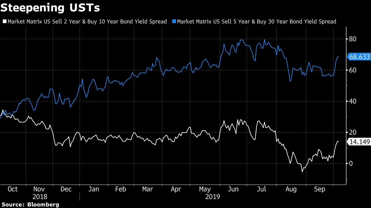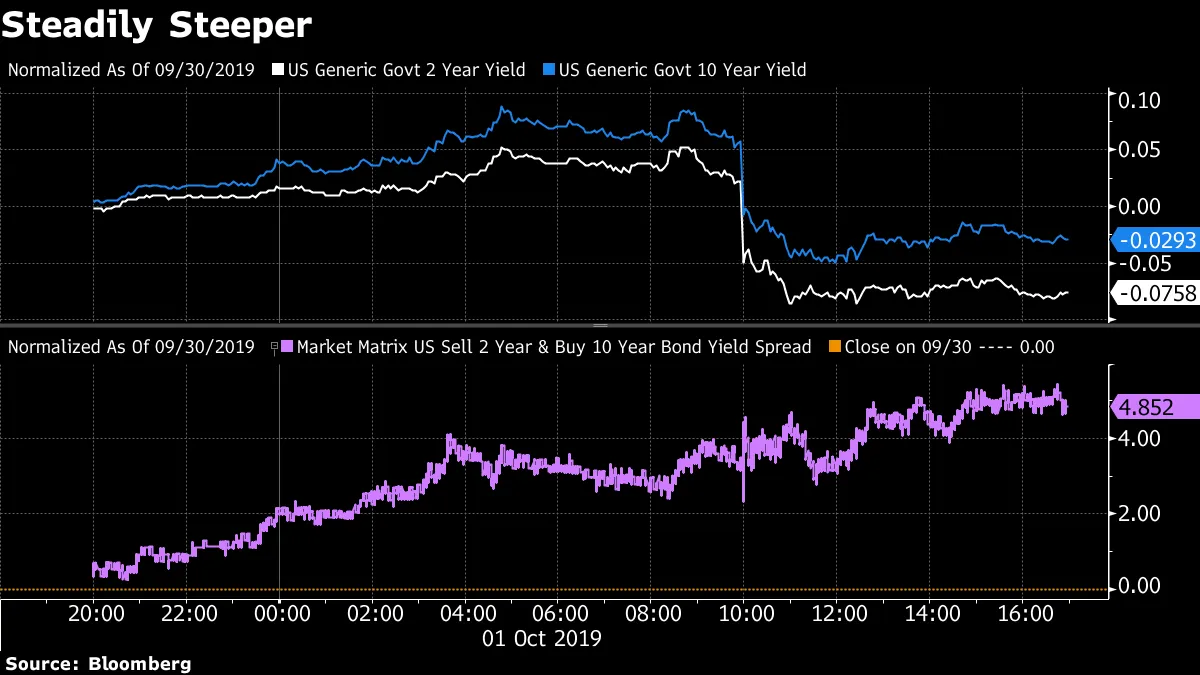 国债在周二承受了一些日本债券面临的损失,随后糟糕的制造业数据导致债券反转。然而,整个交易过程中一致的趋势是两年期和十年期国债收益率曲线的陡峭化,从熊市转向牛市: