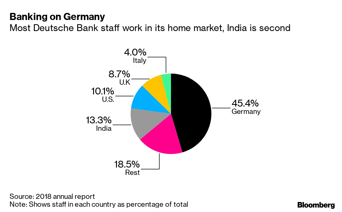 德意志银行计划在德国裁员 大约一半的计划裁员18,000个职位,知情人士表示。伦敦也将 特别受到影响,部分原因是脱欧,而美国在银行退出其股票交易业务后,前台裁员的比例可能会较低。德国计划的裁员规模可能会让分析师感到惊讶,因为首席执行官之前表示该国将看到其“公平”的裁员份额。