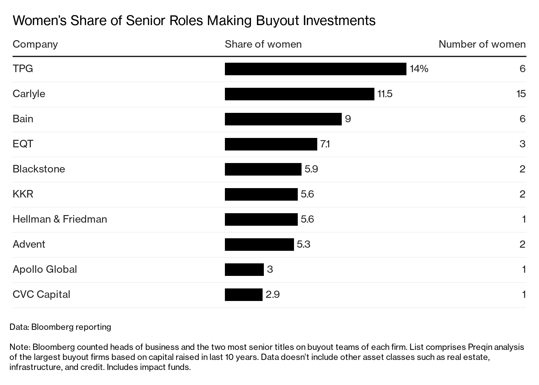如果私募股权交易者是一个微小的经济精英,他们也是一个狭窄的群体。彭博社的分析发现,女性在全球前10大使用债务收购公司的公司中仅占8% 的高级投资职位。