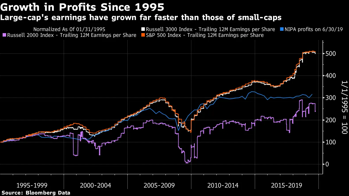如果我们将S&P 500的每股收益增长与NIPA数据进行比较,并与Russell 2000指数(涵盖按市值在美国排名1,001到3,000的小型公司)和Russell 3000指数(包括所有3,000家最大的公司)记录的每股收益增长进行比较,我们得到以下图表: