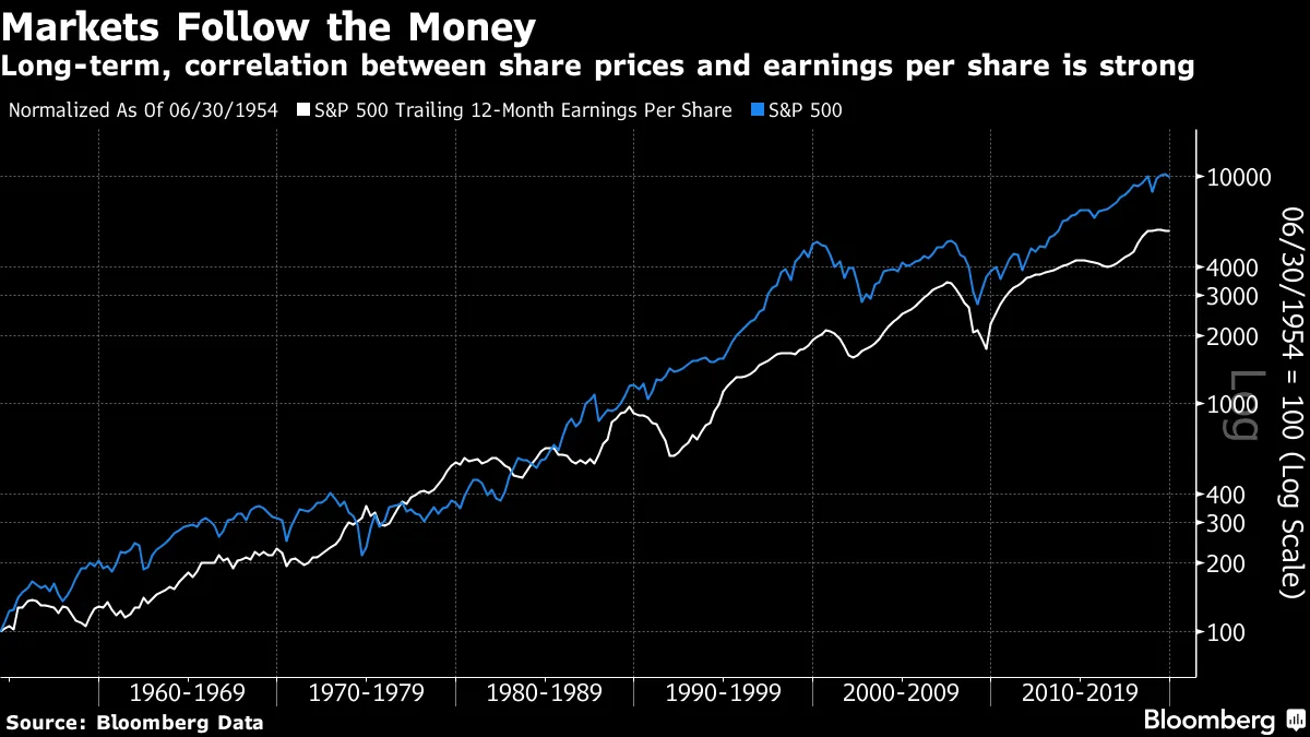 而当谈到整体市场时,盈利也很重要,即使投资者愿意为其支付的倍数随着时间而变化。这就是标准普尔500自1954年以来追踪的过去12个月每股盈利情况: