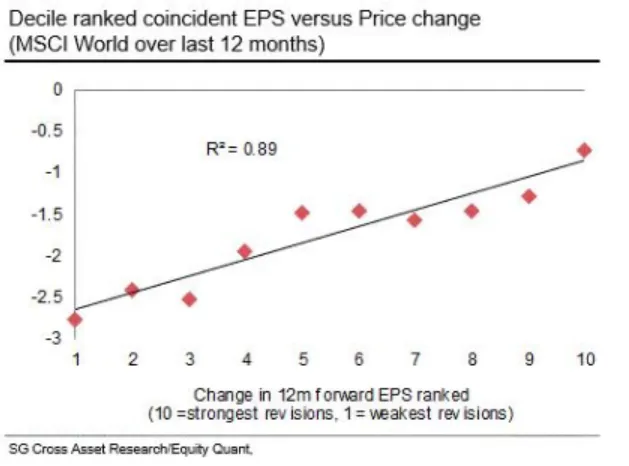 来自法国外贸银行安德鲁·拉普索恩的这张图表显示,盈利增长仍然在不同股票的相对表现中起着推动作用,程度令人惊讶地清晰。过去12个月对发达市场股票来说是艰难的,但限制损失的方法是拥有更强的盈利预测。MSCI世界指数中的股票根据其盈利预测的变化被分为十分位。盈利预测越高,股票表现越好。这个关系并不是完全线性的,但接近: