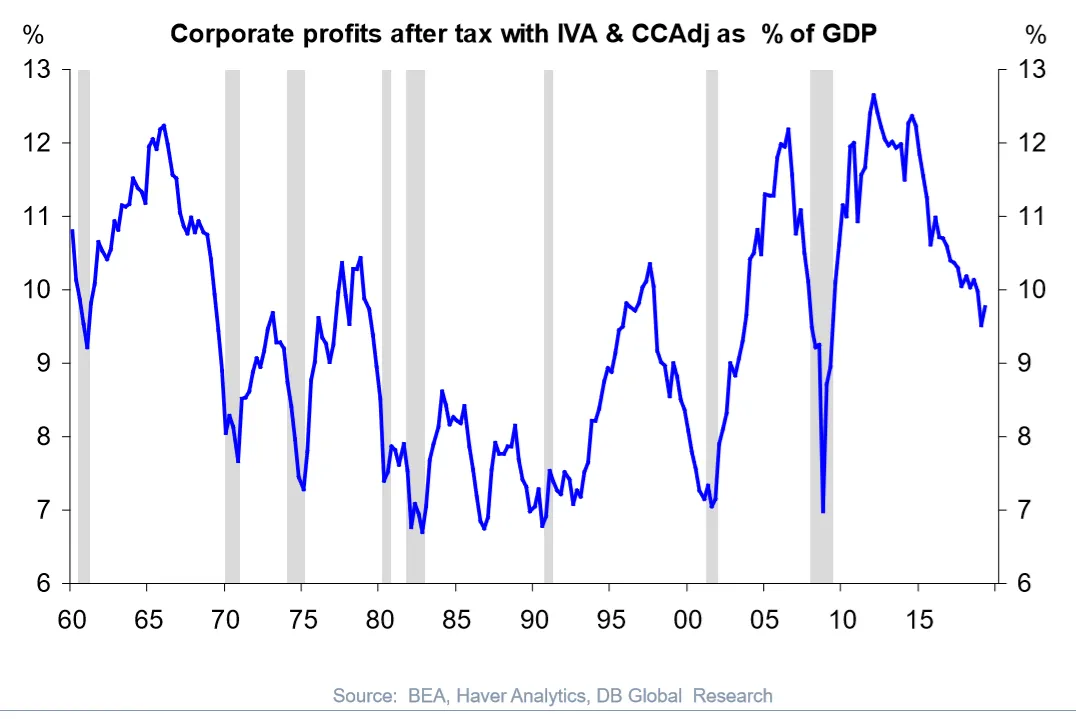 如果我们使用国家收入和利润账户(NIPA),由计算GDP的政府统计人员编制,我们会发现利润率实际上表现得正如我们所预期的那样,商业周期在几年前已经转变。这是NIPA利润占GDP的比例,由德意志银行的托尔斯滕·斯洛克制作的图表: