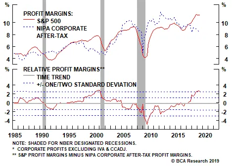 请注意,在金融危机期间,差异在另一个方向上达到了四个标准差,因为会计师们抓住机会“倾倒所有”于本来就会看起来糟糕的收益。这往往强化了我们应该谨慎对待当前强劲利润率的观点。BCA Research预测,这一差距可能会通过降低S&P利润率来缩小。