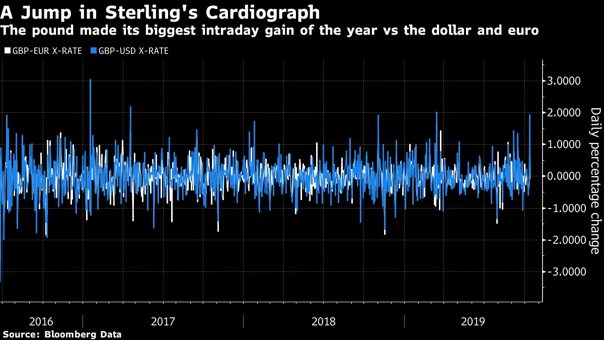为了将此放入更广泛的背景中,周四的跃升在某一时刻是自2017年初以来最大的。在稍微回落后,它仍然与今年春季请求首次延长脱欧截止日期前的兴奋相当: