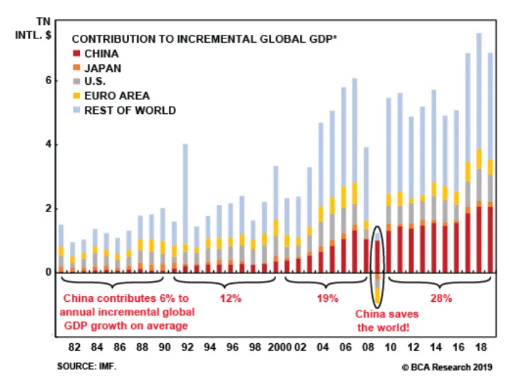 实际上,这并不是一个很大的让步。首先,美国的谈判立场并不像许多美国人认为的那样强,因为中国的增长对每个人都有好处。正如BCA Research Inc.的这张惊人图表所示,金融危机后的那一年,中国占据了全球所有的增长;说它“拯救了世界”并不算夸张。从那时起,它每年贡献了全球增长的约四分之一。美国能够承受的敌意是有限的。