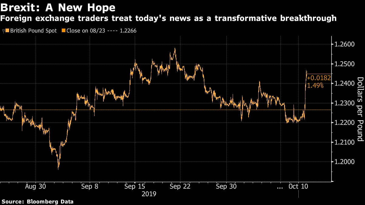 想象所有的人,和平地生活,在北爱尔兰边界的两侧。 正如我在其他地方所写,利奥·瓦拉德卡在利物浦约翰·列侬机场的几句积极的话足以引发10年期国债收益率历史上最大的百分比上涨(这在一定程度上是由于它们达到的惊人低水平),而英镑则享受了自一年前脱欧西敏寺闹剧开始以来的最佳一天。这张图表显示了自8月底以来英镑对美元的走势,当时英国首相鲍里斯·约翰逊的策略短暂地似乎确保了“无协议”脱欧: