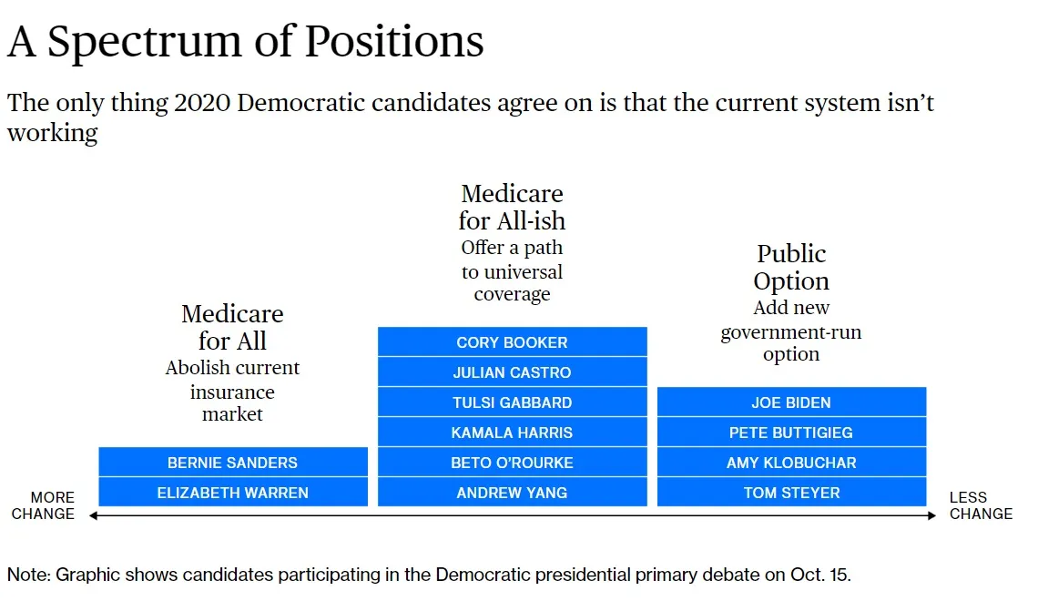 如果你需要周二民主党辩论的视觉辅助,这里有一张来自 马克斯·尼森 和 艾琳·何 的图表,显示所有民主党人在全民医保上的立场: