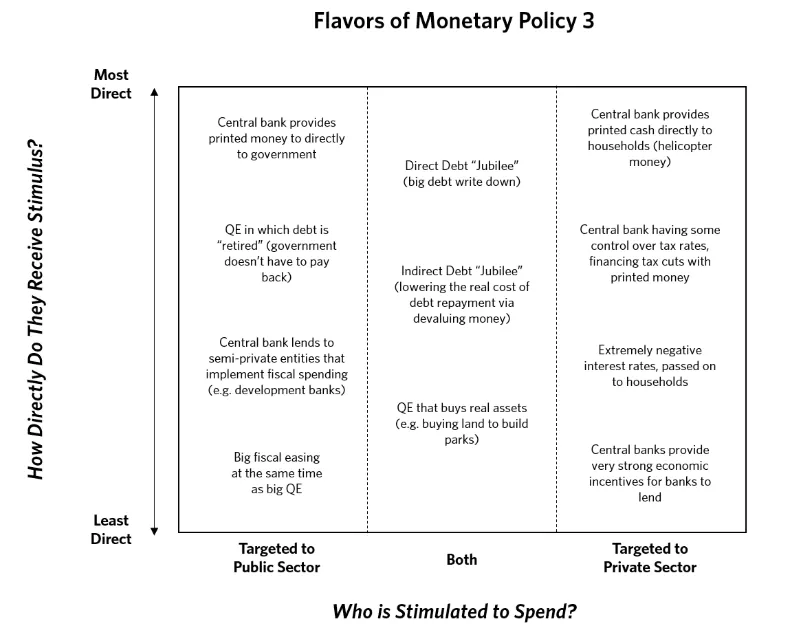 亚尔登的文章是 弗朗西斯·科波拉的《人民的量化宽松的案例的良好伴侣,这是本月《作者笔记》彭博书友会的选书。任何有彭博终端访问权限的人都可以参与。我们将在即将到来的10月17日星期四纽约时间上午11点与我、科波拉和彭博观点同事克莱夫·克鲁克进行在线辩论。请提前通过电子邮件发送评论和问题(即使您不在终端上),邮箱是[email protected]。科波拉的书简洁明了,大约三小时即可读完。为了进一步阅读,亚尔登提到这篇 由贝莱德公司于八月发布的极具影响力的论文,该论文建议值得考虑直升机货币。由于其共同作者包括斯坦利·费舍尔,前美联储副主席,他撰写的宏观经济学教科书被一代经济学家在大学时阅读,因此产生了重大影响。还可以阅读 桥水基金的瑞·达里奥在LinkedIn上的这篇文章,该文让许多人感到震惊,因为它认真对待了直升机概念。由于我们希望讨论是实用的,请查看达里奥关于不同可能的直升机投放的图表。如果支持,你更喜欢哪一种?如果反对,这些政策真的会造成损害吗?