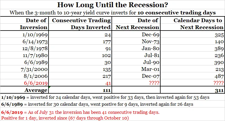 我们关注这个奥秘,因为倒挂的收益率曲线可能是即将到来的衰退最可靠的指标。三个月/十年曲线的记录非常出色,自战争以来每次衰退之前都出现过,没有假阳性和假阴性。倒挂需要持续一段时间才能发出明确的信号,而两年/十年倒挂在八月份仅持续了几天。