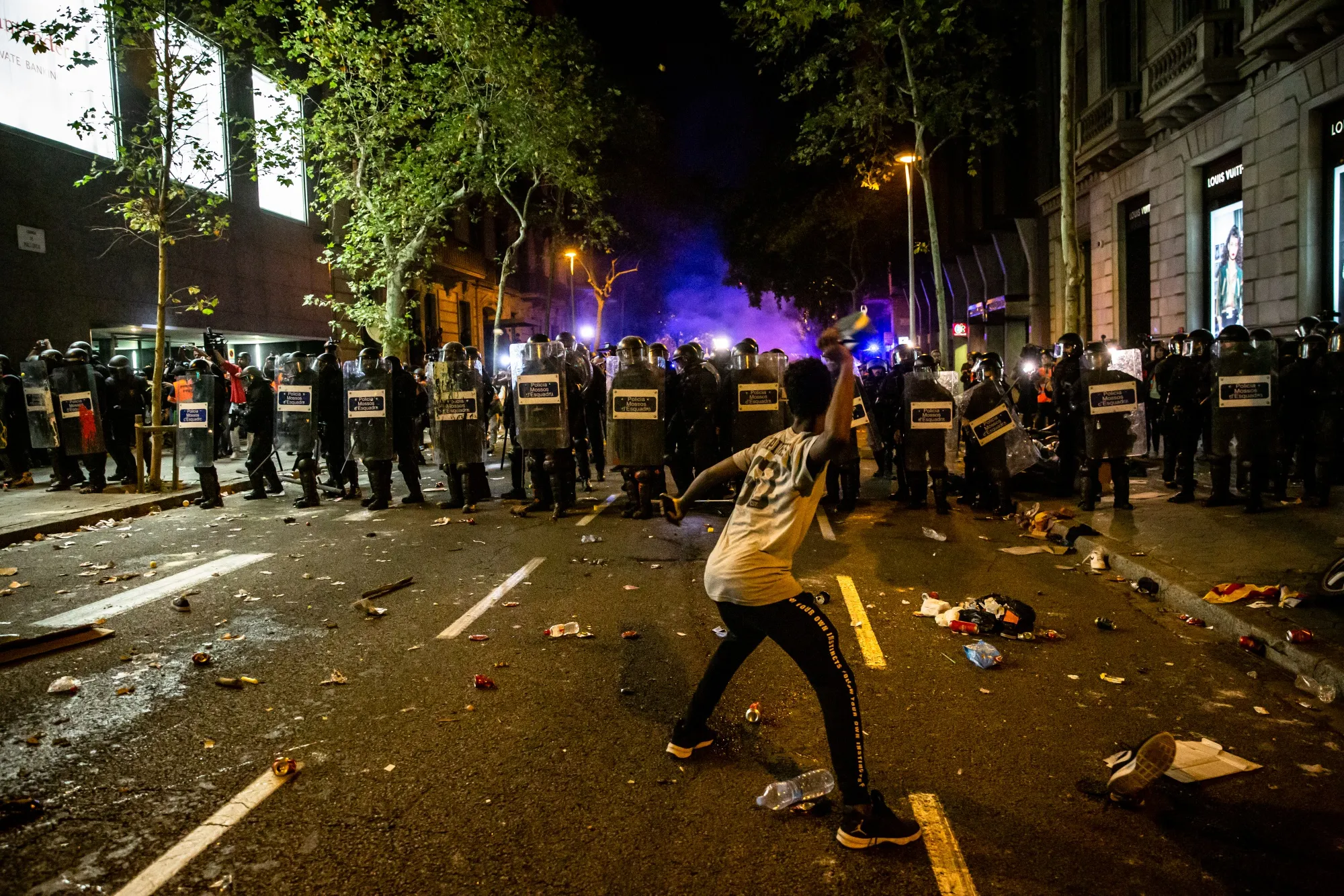一名示威者在10月15日向巴塞罗那的警察投掷物体。摄影师:安赫尔·加西亚/彭博社一名示威者在巴塞罗那向警察投掷物体。摄影师:安赫尔·加西亚/彭博社