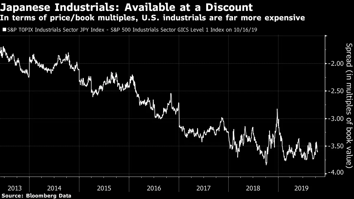 另一个乐观的关键原因是投资者对 中国的愿景。日本的工业部门有很多世俗的公司,应该会从邻国的刺激中受益。而且,与标准普尔500工业部门的公司相比,日本工业股在市净率方面的折扣非常显著。即使在安倍试图重新唤醒日本经济的过程中,这一折扣也在不断加深: