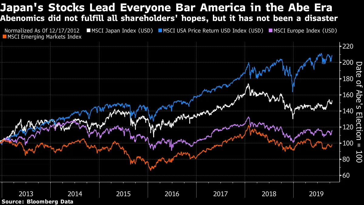 “安倍经济学”是由安倍晋三首相在2012年当选时倡导的雄心勃勃的计划,旨在激活日本停滞不前的经济。最初,这个有三支“箭”的计划——积极的财政和货币改革,随后是企业治理和结构性变革的第三支箭——使日本股票在全球领先。正如图表所示,它们的表现确实舒适地超过了欧洲和新兴市场——但日本仍然落后于美国。