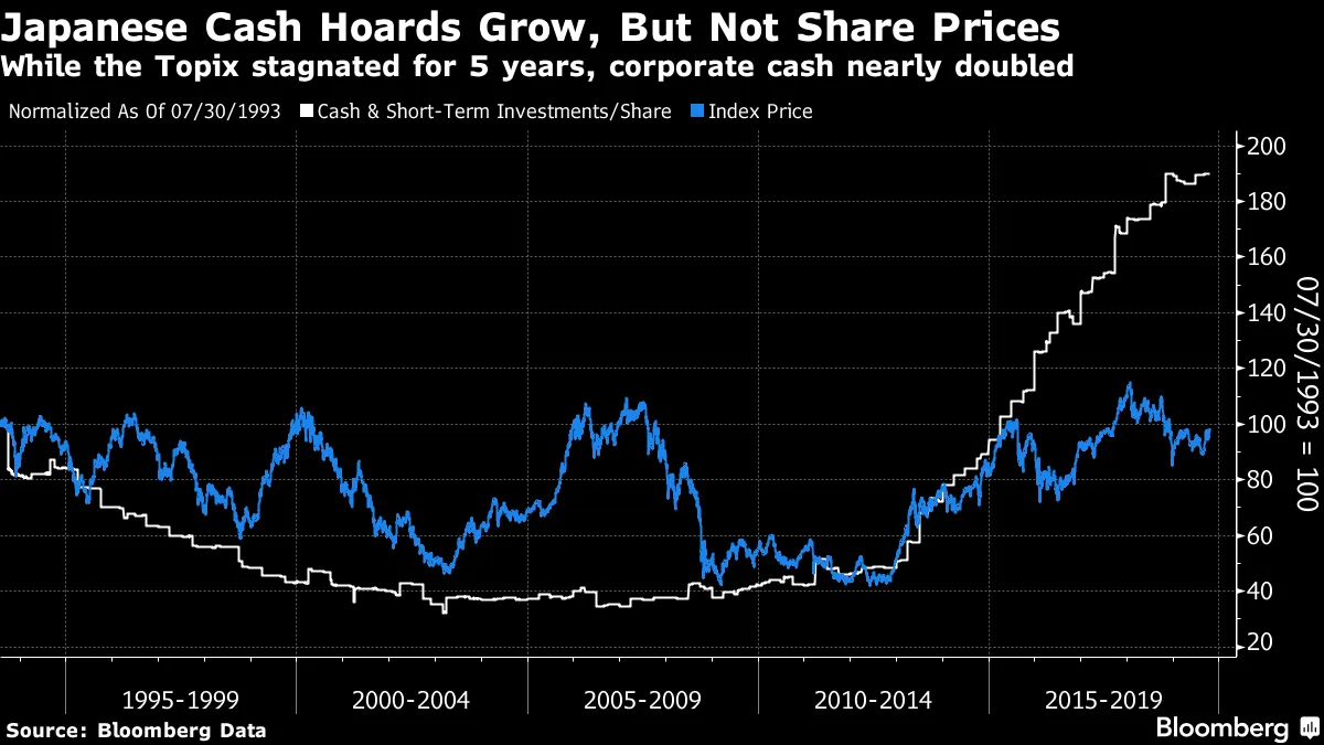 这是为什么呢?一般来说,日本企业对 安静的生活 有着致命的偏好。确实,在安倍时代,公司们成功地产生了更多的现金流,而它们的反应是让现金余额不断增加。正如这个图表所示,Topix中的公司的现金和短期投资在过去五年中几乎翻了一番,而其股东投资组合的价值(由该指数表示)则保持不变: