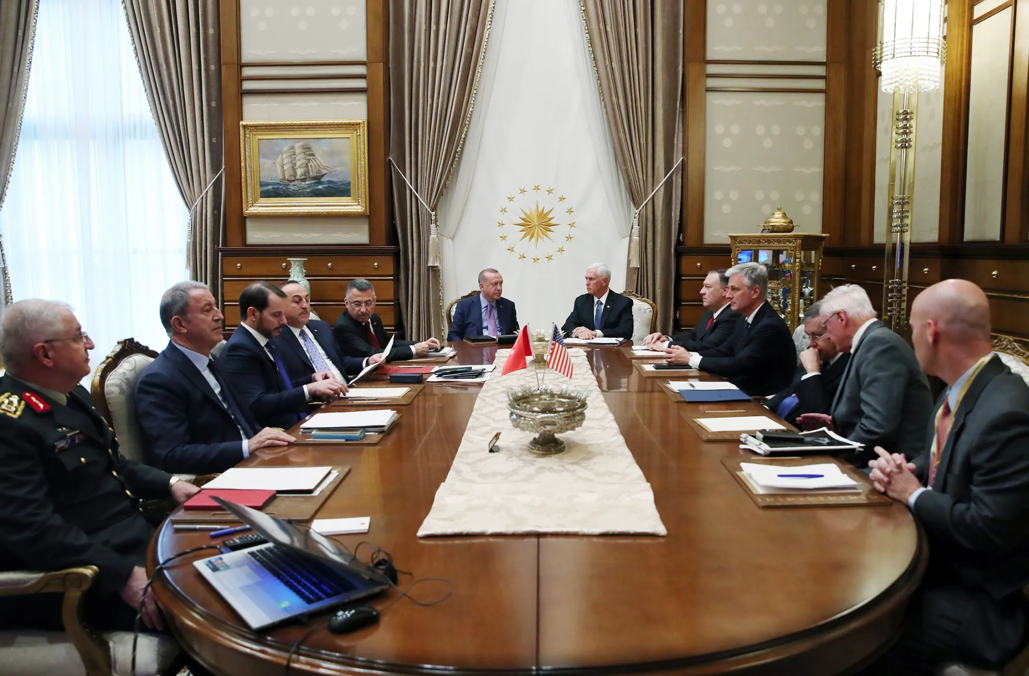 安卡拉,2019年10月17日——土耳其总统雷杰普·塔伊普·埃尔多安(左,中)于2019年10月17日在土耳其安卡拉与美国副总统迈克·彭斯(右,中)会晤。美国和土耳其在周四达成了一项为期五天的停火协议,并在叙利亚北部建立安全区,土耳其军队曾在此与库尔德民兵作战,此次会谈在土耳其首都安卡拉进行。(照片由穆斯塔法·卡亚/Xinhua通过Getty提供)(Xinhua/通过Getty)摄影师:新华社/新华社埃尔多安与美国副总统迈克·彭斯会面讨论停火事宜。摄影师:穆斯塔法·卡亚/新华社通过Getty Images。
