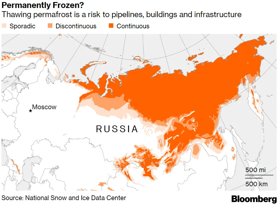 俄罗斯将更加关注气候变化的影响,因为其广阔的永久冻土区的融化使管道和基础设施面临风险。这对采矿、石油和天然气公司尤其令人担忧,因为该地区占其石油的15%和天然气的80%。一位俄罗斯官员表示,经济损失高达1500亿卢布(23亿美元)每年。