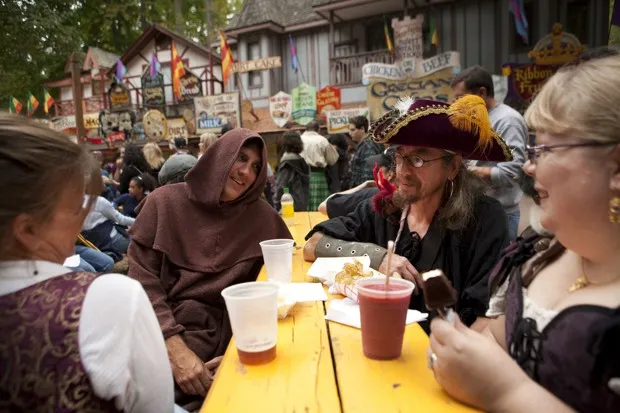 2009年节日参与者的桌子。大卫·S·霍洛威/盖蒂图片社但这个博览会也是一个紧凑的幻想小镇设计杰作。尽管人潮涌动,竞争景点的喧嚣(许多像自动取款机和移动厕所一样,是对21世纪需求的不美好适应),雷维尔格罗夫依然是一个宁静的空间,一个看似被无路可寻的森林包围的、充满苔藓的老式半木结构建筑的人性化小村庄。它蜿蜒的小巷邀请人们随意漫步,而不是像传统游乐园的游客那样从一个景点走到另一个景点。文艺复兴节可能不是体验我们祖先生活的非常真实的方式,但它是重新连接现代性中常常感到不对劲的事物的绝佳方式。