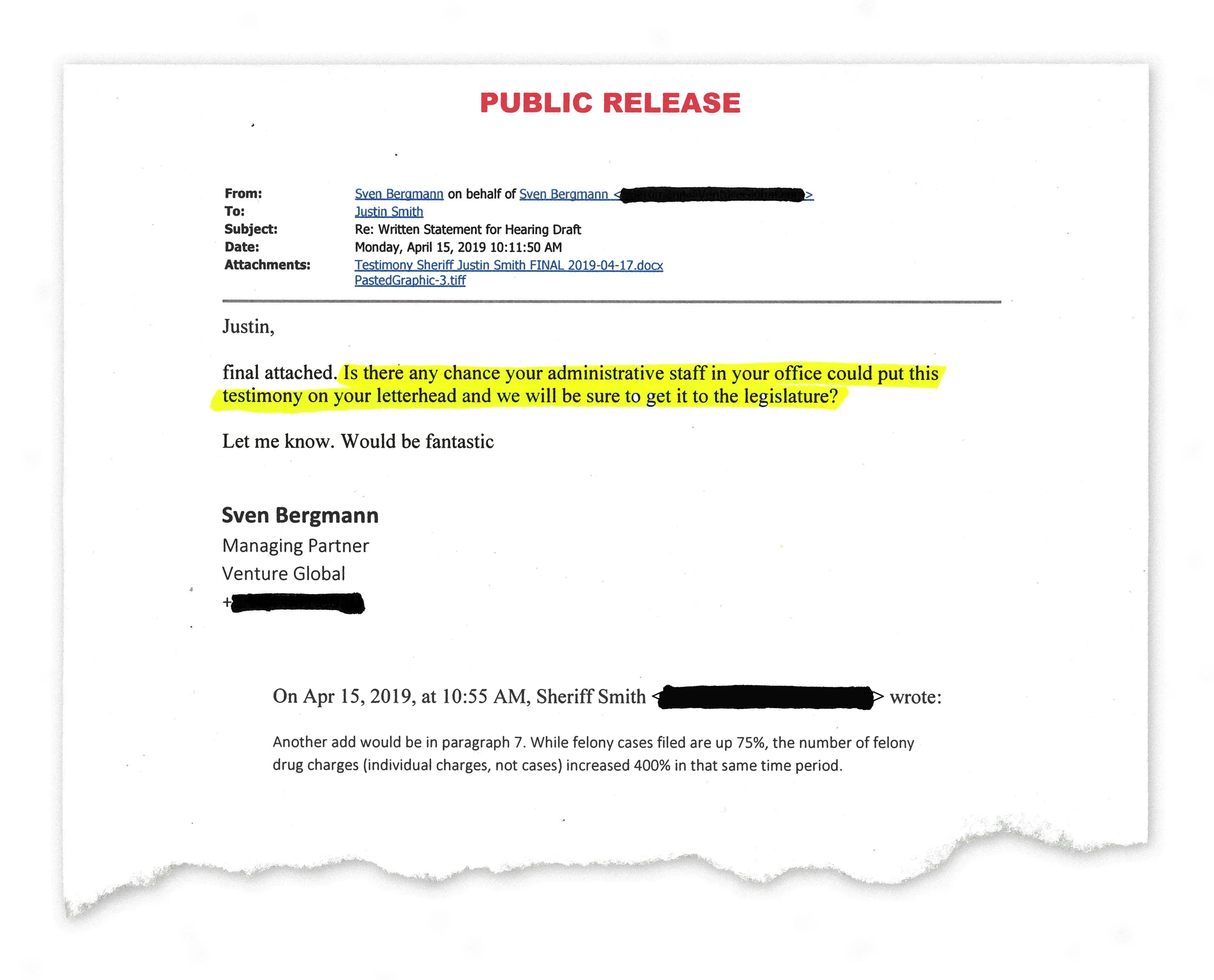 内部电子邮件显示,社论和证词的草稿是由与该非营利组织合作的顾问斯文·贝格曼提供给史密斯的。“我们试图捕捉你的观点,它们很好地融入了这篇文章,”贝格曼在给史密斯的电子邮件中写道。贝格曼没有回复寻求评论的电子邮件和电话留言。
