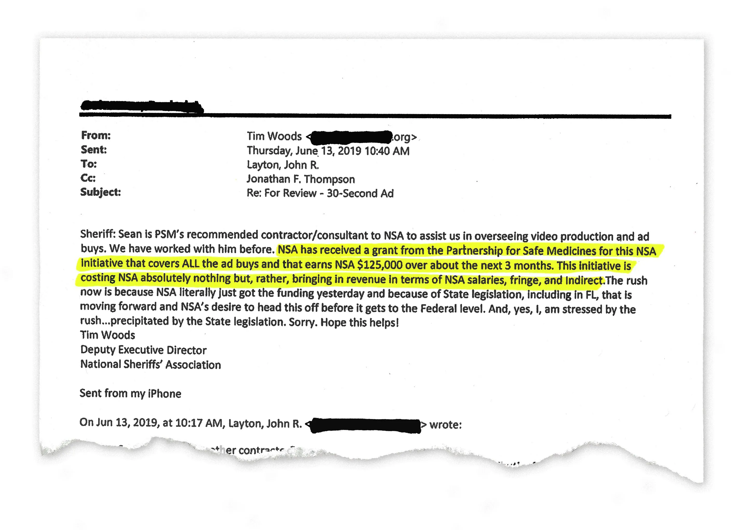 在6月的一次电子邮件交流中,警长协会的一位领导告诉一位成员,针对药物进口的广告活动是一个重要的盈利项目,将用于支付员工工资和运营费用。“NSA已从安全药物合作伙伴那里获得了一项资助,用于这个NSA倡议,涵盖所有广告购买,并在大约接下来的3个月内为NSA赚取125,000美元,”该团体的副执行董事Tim Woods写道。
