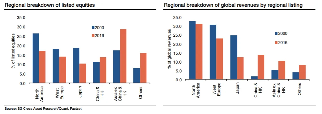 与此同时,我们发现,自千年之交以来,美国股票的总数显著减少,而其他国家则在这方面有所弥补。这在上市公司总数和它们产生的收入上都是如此,尤其是西欧和日本的公司数量有所下降。