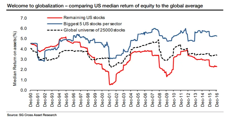 那么,集中度主要是美国现象吗?这是否有害?Lapthorne的这张图表显示,每个美国行业中五大公司的盈利能力确实远高于其他公司。这一差距在过去20年中显著扩大。但“其他公司”的中位盈利能力与全球中位盈利能力相差不大。