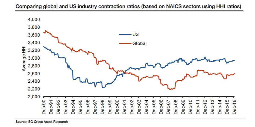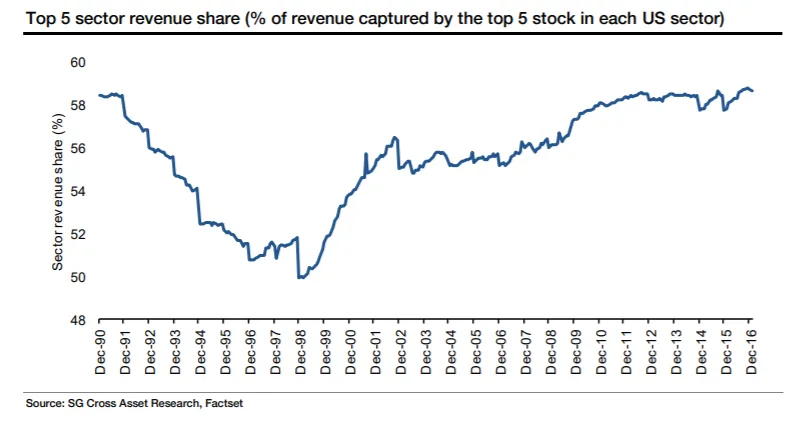 建立护城河真的对社会有害吗?法国兴业银行首席量化全球股票策略师安德鲁·拉普索恩两年前发布了一份关于行业集中度的大报告,提出了一些可能的论点修正。虽然这些数字现在略显过时,但仍然相关。如果我们查看每个行业前五家公司按收入的市场份额,我们会看到美国的集中度确实在增加,但仅在1990年代经济繁荣(并且合并频繁)十年期间显著减少之后: